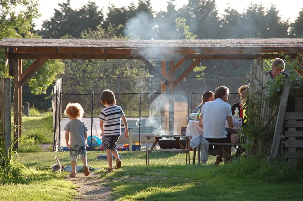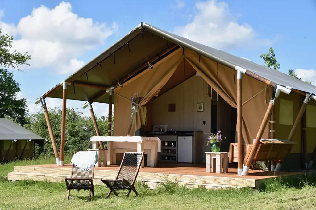 Voor ons statige woonhuis bevindt zich het terras onder de linden waar je 's ochtends je brood kunt halen in de Torenwinkel en waar je kunt genieten van een cappuccino of een lokaal biertje. In het park en de weide achter het huis staan 8 Safaritenten, uitgerust met badkamer en eigen wc.